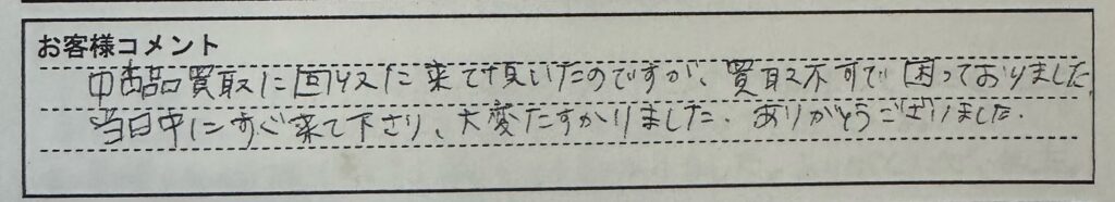 買取不可で困っておりました。当日中に来てくださり、大変助かりました。