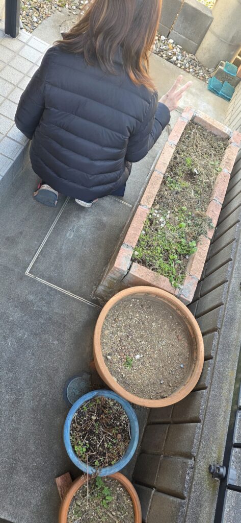 土のこぼれ落ちもホウキで掃き清めて