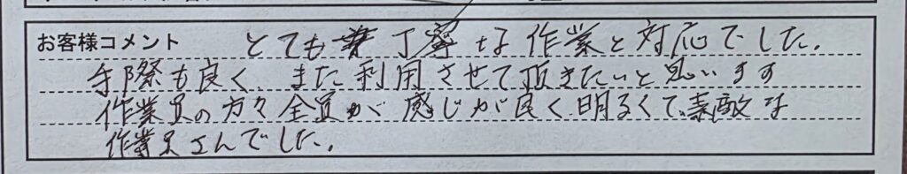 「とても丁寧な作業と対応でした手際もよくまた利用させていただきたいと思います。作業員の方々全員が感じがよく明るくて素敵な作業員さんでした。」