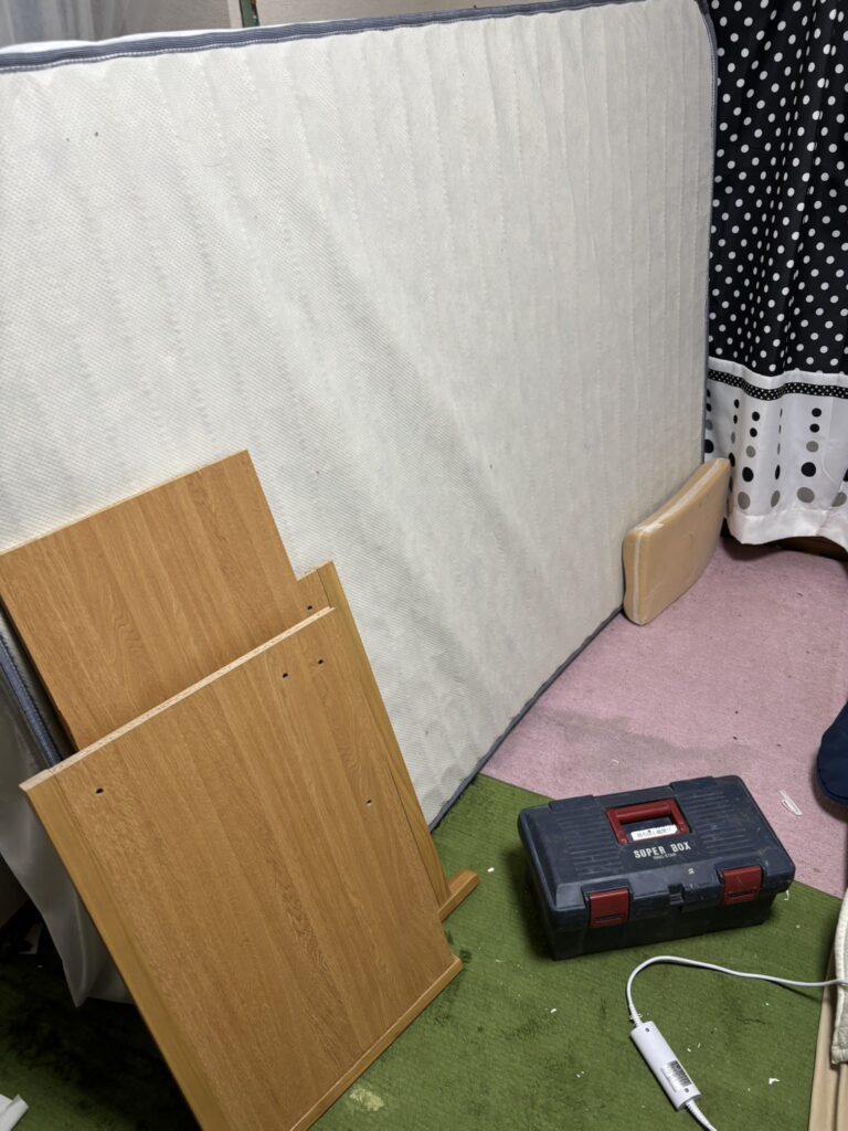 - 生活用品一式木製ベッドフレームマットレスその他不用品学習机厚手マットレスベッド寝具一式ベッドフレーム掛け布団毛布敷布団シーツ枕木くず子供部屋の不用品学習デスク2階から搬出する大型家具木製デスク解体対象家具(室内解体)椅子デスクワゴン(袖机)家具解体片(木材)粗大ごみ学習椅子(デスクチェア)