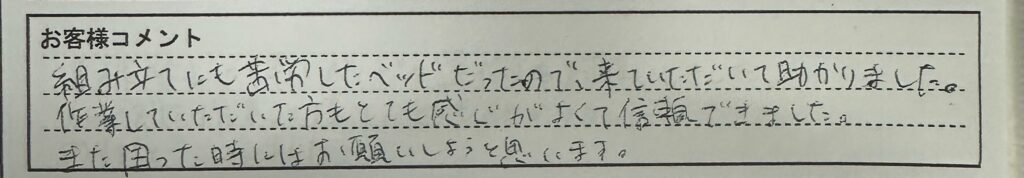 「組み立てにも苦労したベッドだったので、来ていただいて助かりました。