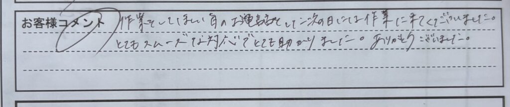 > 「作業をしてほしい日にお電話をして次の日には作業に来て下さいました。とてもスムーズな対応でとても助かりました。ありがとうございました。」