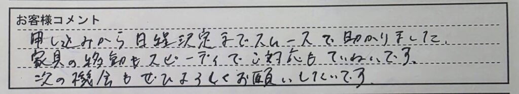 お客様の声: 「申し込みから日程決定までスムースで助かりました。家具の移動もスピーディでご対応もていねいです。次の機会もぜひよろしくお願いしたいです。」