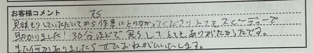「すぐ見積もりしていただいてから作業にとりかかってくださり、とてもスピーディーで助かりました!30分ほどで完了してとてもありがたかったです。また何かありましたらぜひお願いいたします。」